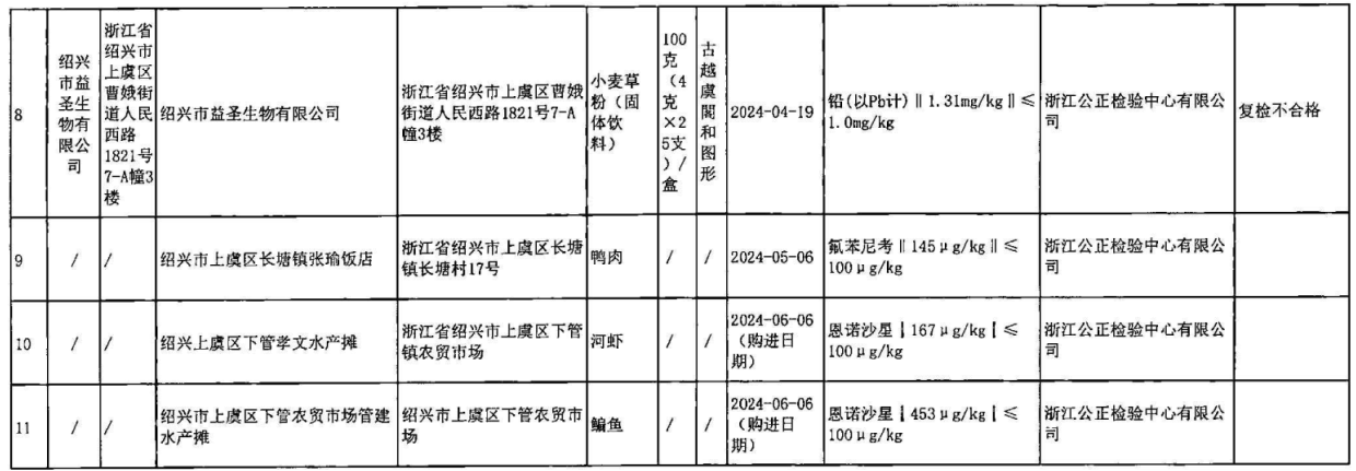 (一)绍兴市益圣生物有限公司生产的小麦草粉(固体饮料),铅(以Pb计)不符合食品安全国家标准规定。检验机构为浙江公正检验中心有限公司。绍兴市益圣生物有限公司对检验结果提出异议,并申请复检,经浙江省食品药品检验研究院复检后,维持初检结论。